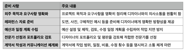 외주 목적 명확화, 레퍼런스 준비, 예산 및 일정 관리, 전문가 선정, 계약서 작성의 5가지를 철저히 준비하면 성공 확률을 크게 높일 수 있습니다. 프로젝트의 시작 단계부터 꼼꼼히 계획하고 준비한다면 원하는 결과물을 효율적으로 얻을 수 있을 것입니다.